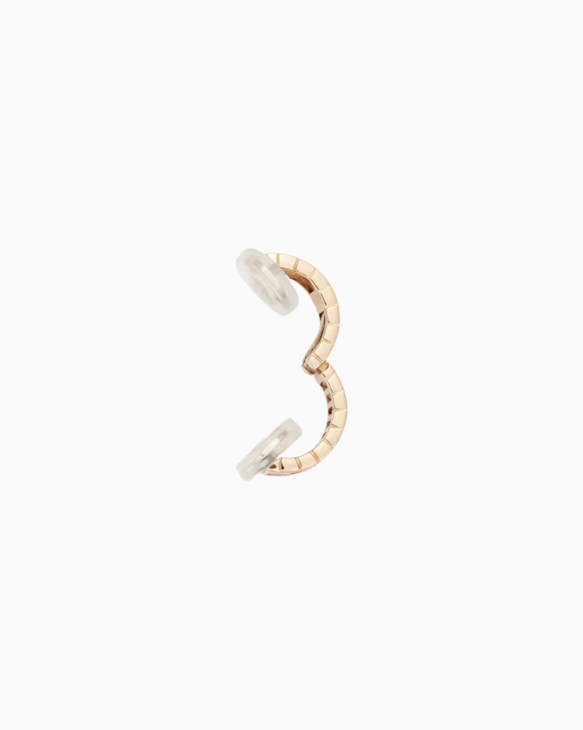تصميمنا الرمزي لأقراط الأذن اليومية. هذا السوار الفردي القابل للعكس مصنوع من صف من أحجار الزمرد المقطوعة على شكل باغيت بنمط عضوي، مثبتة في ذهب أصفر مصقول عيار 18 قيراطًا.