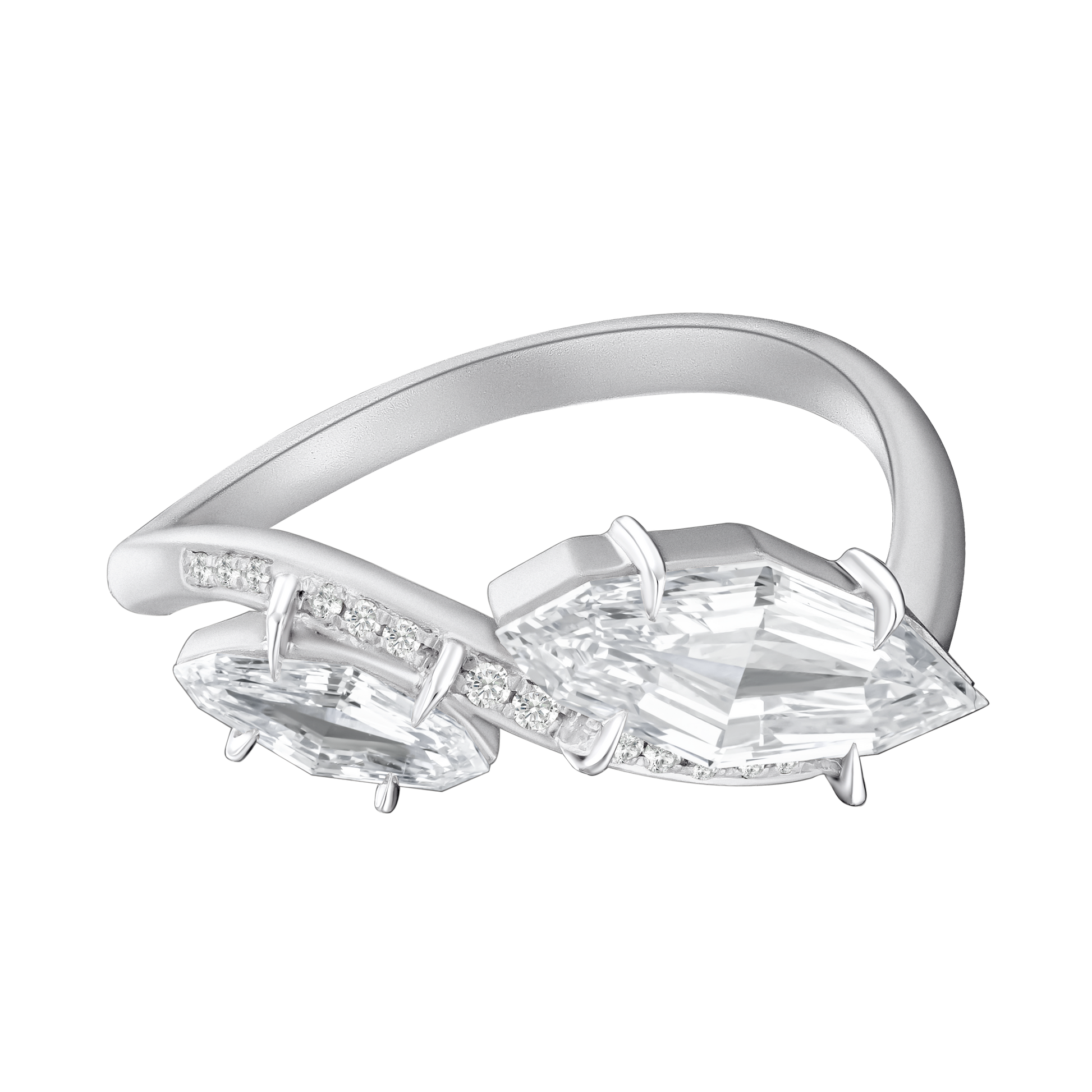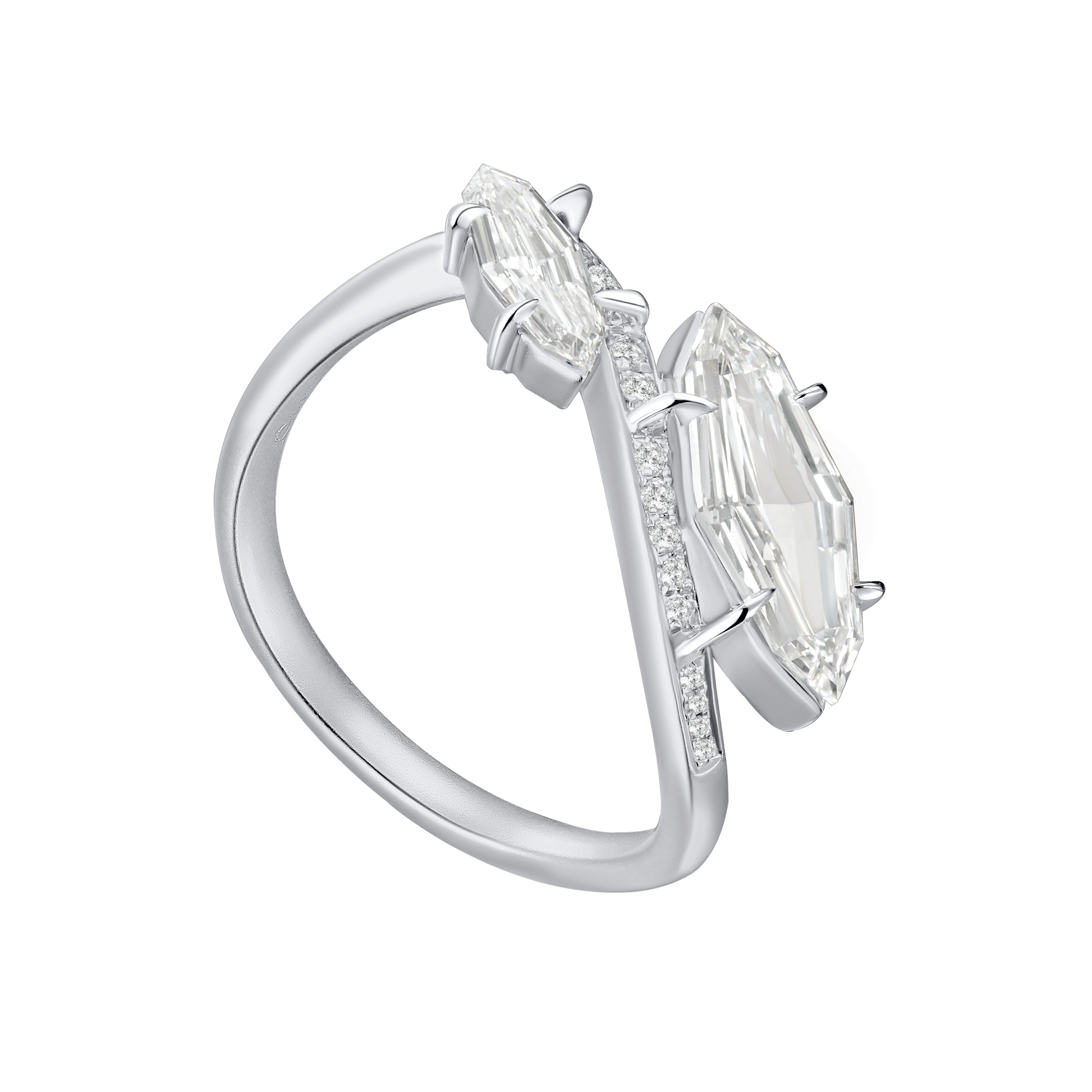 This ring features two step-cut marquise diamonds floating in harmony—set apart yet interconnected—symbolizing the dual forces of celestial motion: light and gravity. With a total of 1.46 carats of diamonds and weighing 3.4 grams of gold, it captures the balance between resistance and surrender, embodying the delicate dance of celestial bodies.