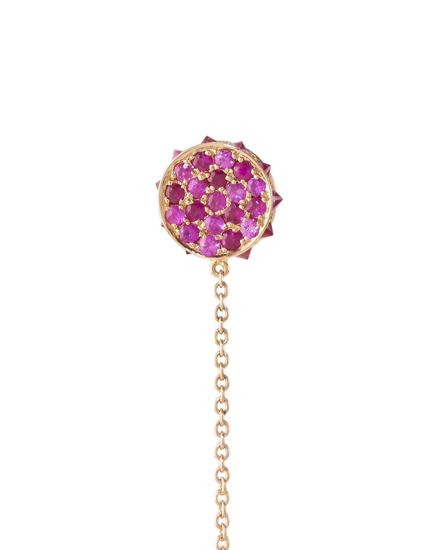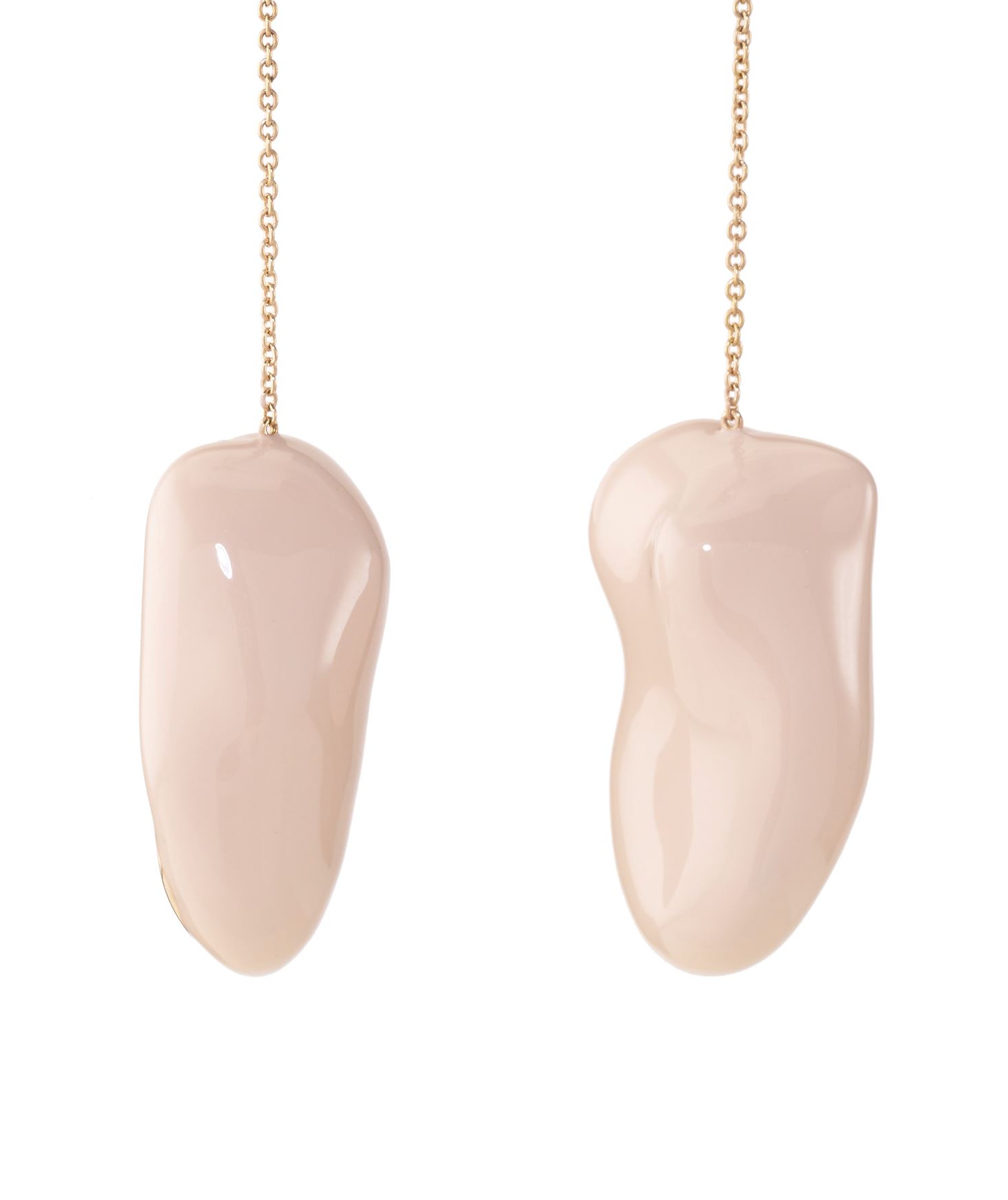 Two halves of a geode make a show-stopping whole in this one-of-a-kind pair of pink sapphire and flare motif earrings. Adorned with 18k rose gold and white diamonds, the pink hued crystal center pierced with clusters of colored sapphires twirl and twist in effortless tandem with the wearer's movements. Sure to become a treasured heirloom, the Flare Nude Geode Dangle Earrings are encapsulated by nude enamel making it equal parts timeless and chic.