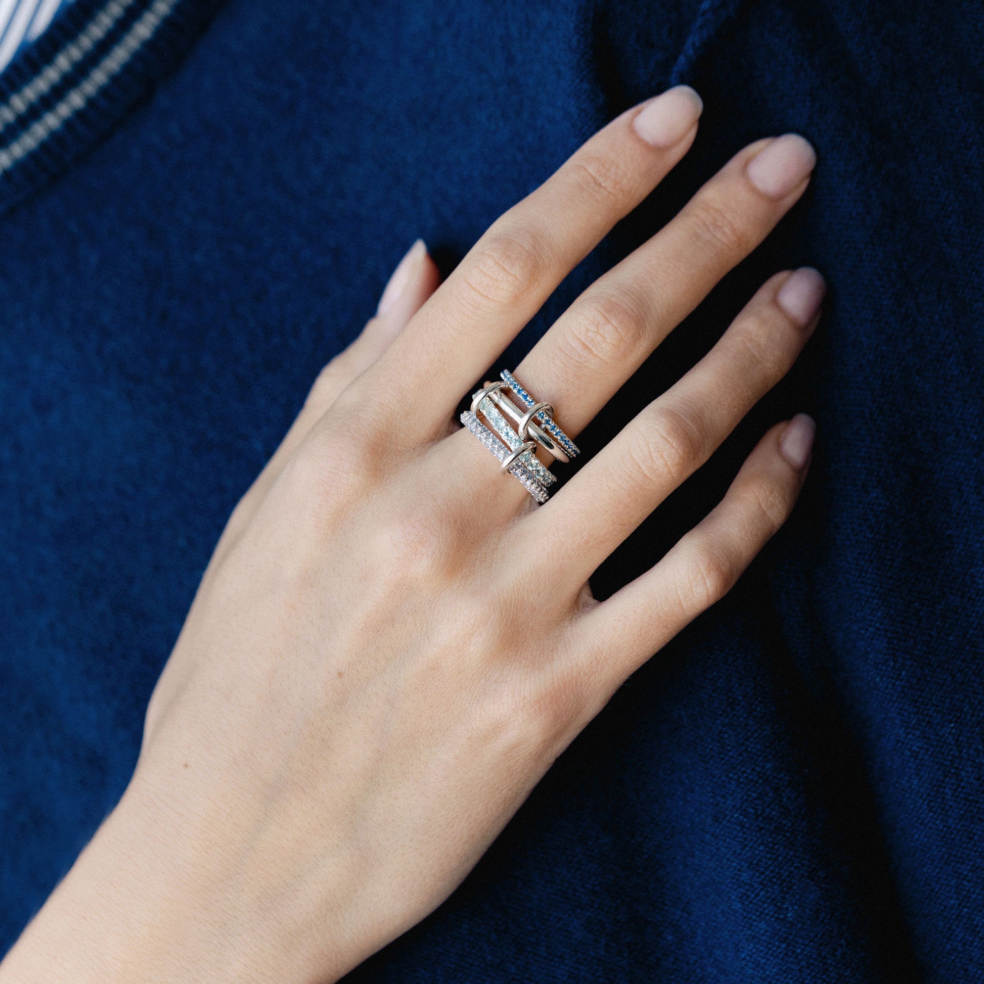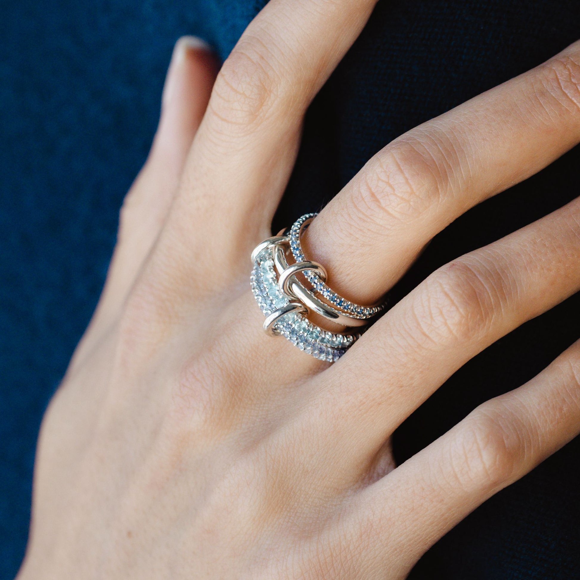 The Iris is constructed entirely from .925 sterling silver and features four luminous bands of pavé-set gemstones. Medium blue sapphires, aquamarine and tanzanite stones mirror the spectrum of blue tones found in cascades of iris petals. Tactile, orbiting connectors of solid .925 sterling silver link each band together, making the Iris perfect for wearing stacked or across multiple fingers. Each Iris is individually handmade in Los Angeles.