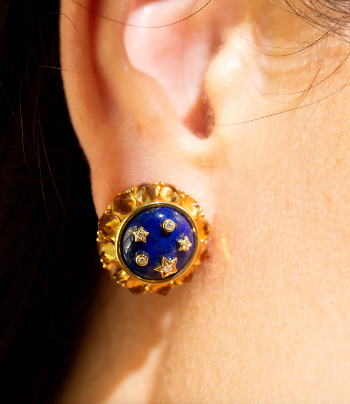 Button stud earrings add serious polish to any look. With the Flare Lapis Lazuli and Citrine Button Stud Earrings, you’ll also harness the majesty and magic of the heavens. A glittering celestial scene is at the heart of these 18kt yellow gold earrings, a symbol of courage and wonder. A sprinkling of diamond-set stars float in a lapis lazuli sky, itself sparkling with individual inclusions. Each earring is slightly different, a modern and luxurious detail. Not only reminiscent of a night sky, bewitching Lapis Lazuli is also symbol of friendship and courage. Used as a personal talisman, lapis helps encourage meaningful connections and strengthen authentic relationships. The stunning earrings are given a final flourish with a glowing halo of warm yellow citrine. The inverted stones are a Marmari signature; debuted in the Wish Upon a Star collection, they are a subtle yet striking nod to the rays of the sun. These sophisticated earrings are a beautiful celebration of friendship and connection, making them not only a gorgeous self-purchase but a truly meaningful gift.