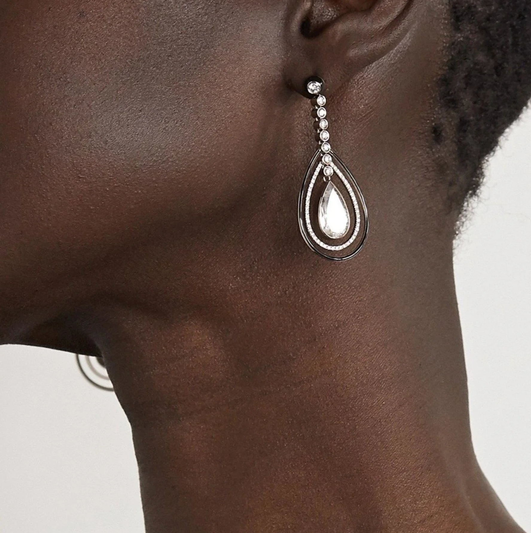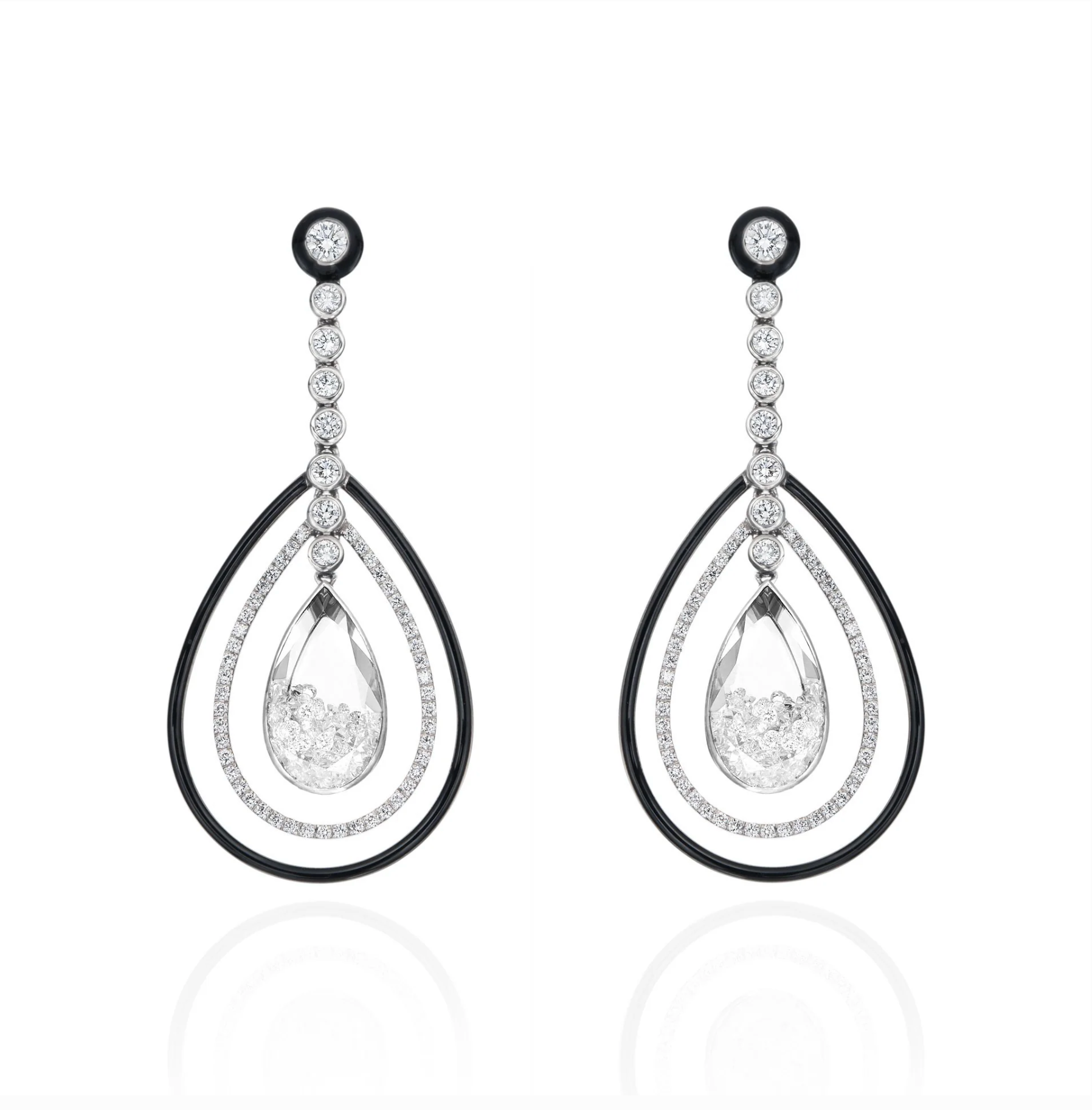 Earring with 2.21ct of diamonds set in and enclosed in white sapphire Kaleidoscope Shakers™ in 18k palladium gray gold and enamel