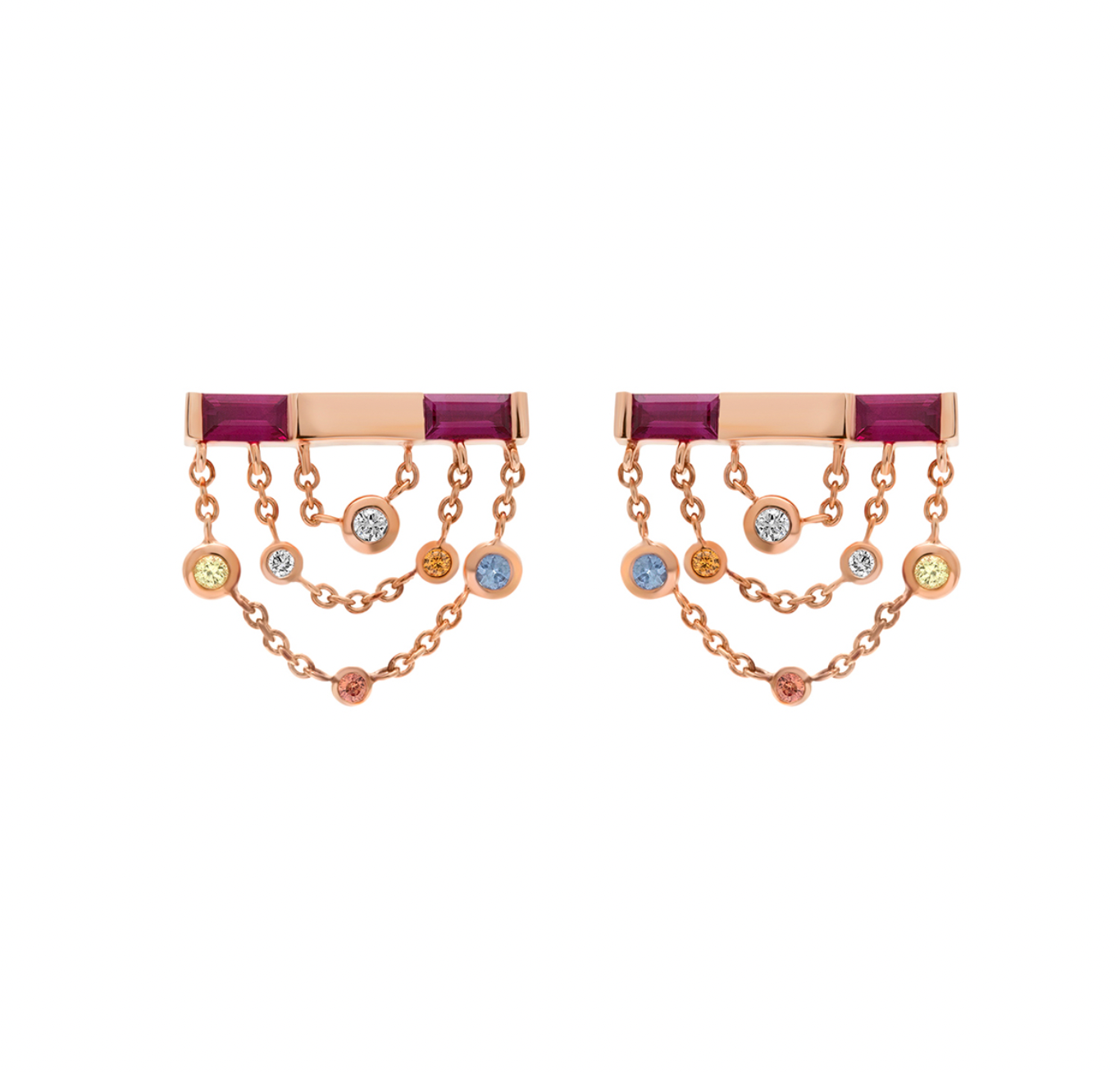 Clever statement stud earrings create a magnetic field around you. Lucky ruby baguettes attract diamonds, aquamarines, and orange and yellow sapphires, set in rose gold. Wear them for day or evening to keep good feelings close.