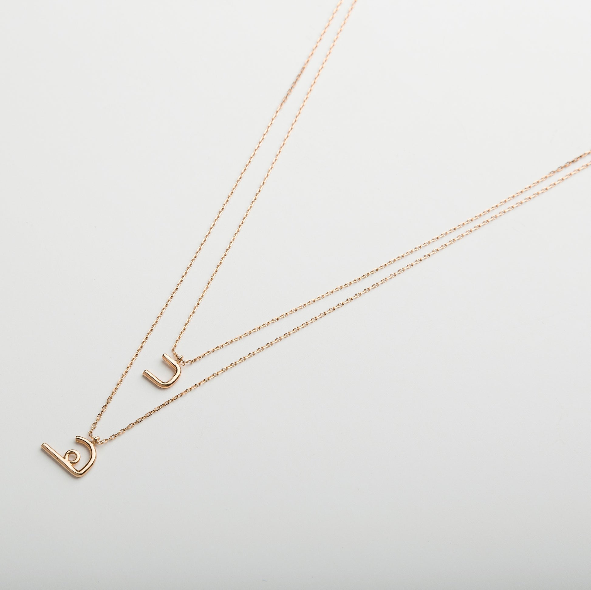 Majorel dainty double-layered letters necklace is a two-story yellow gold chain necklace with two pendants in the shape of Arabic letters. A diamond will be added on the dot of the Arabic letter if it requires it. Each Majorel piece is handcrafted in Kuwait. The necklace is available in 18 karat yellow gold, rose gold, and white gold.