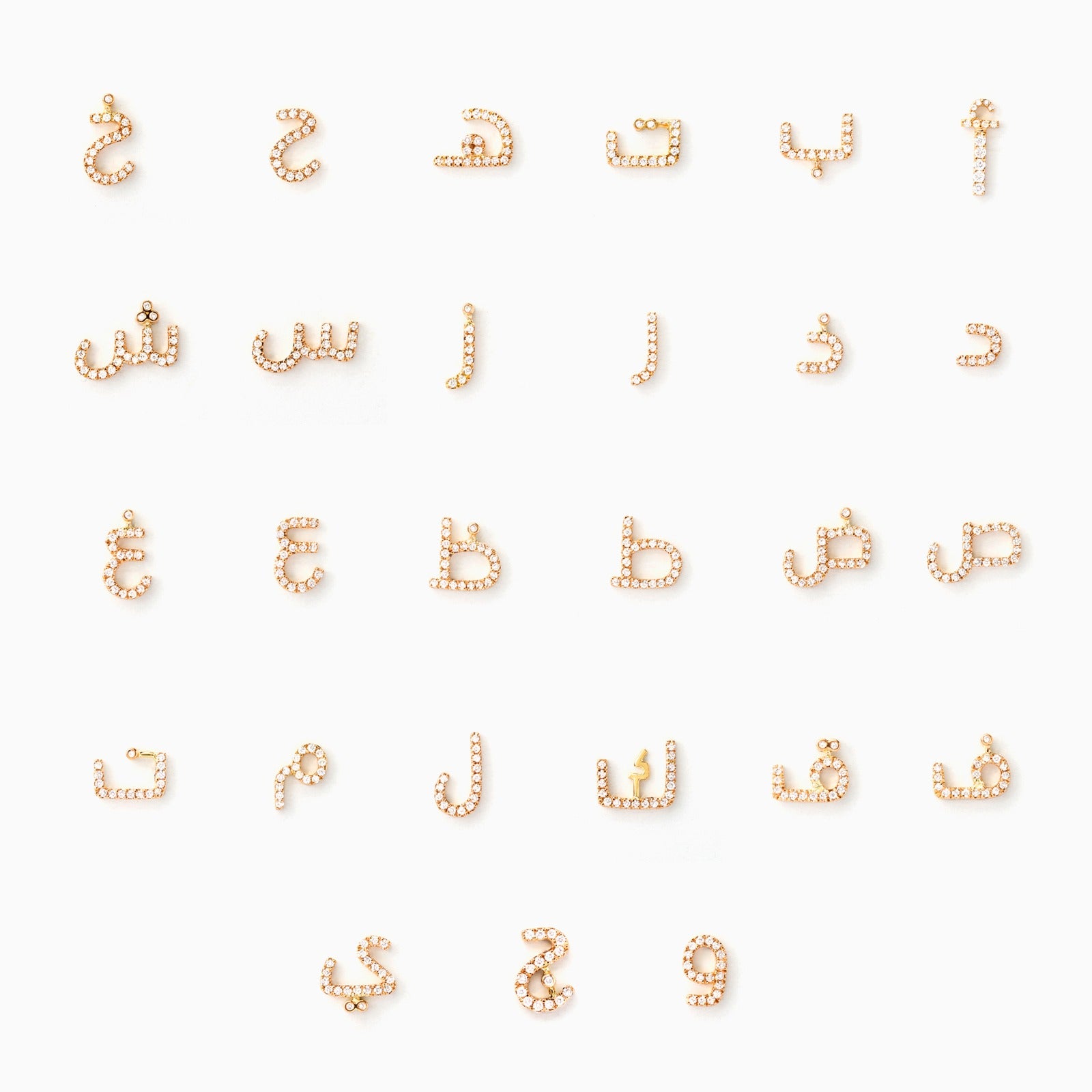 Majorel delicate paved double-layered letters necklace is a two-story yellow gold chain necklace with two pendants in the shape of Arabic letters paved with illustrious white diamonds. Each Majorel piece is handcrafted in Kuwait. The necklace is available in 18 karat yellow gold, rose gold, and white gold and the total weight of white diamonds varies according to the selected letters.