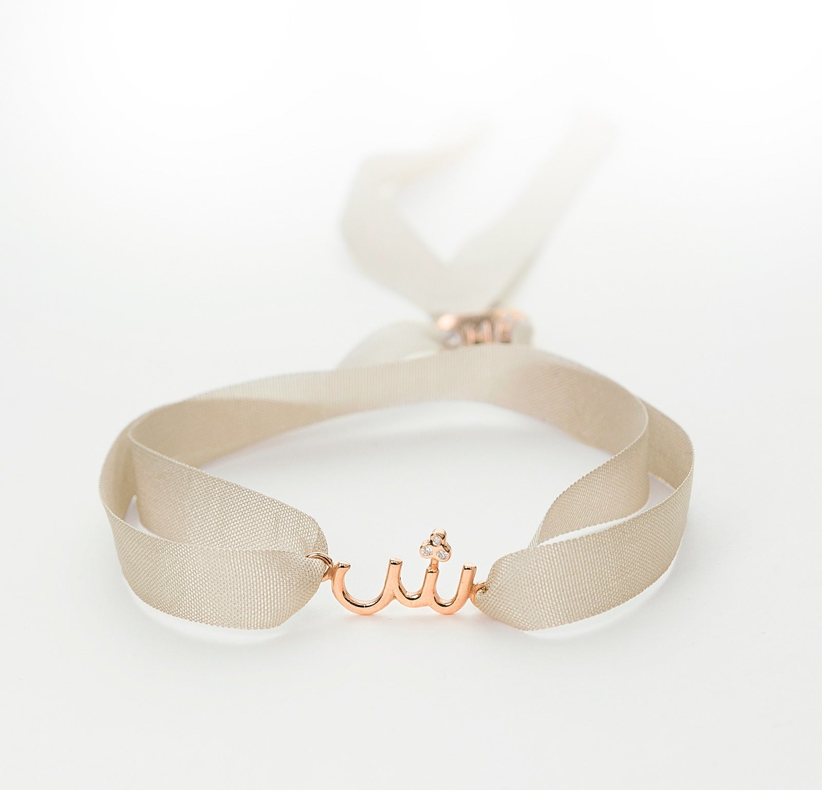 Majorel dainty letter bracelet is a silk ribbon bracelet with a pendant in the shape of an Arabic letter with a white diamond on the dot of the letter. Each Majorel piece is handcrafted in Kuwait. The pendant is available in 18 karat yellow gold, rose gold, and white gold and the total weight of the white diamond varies according to letter. The silk bracelet comes in multiple colors (white, cream, light brown, grey. black, olive green, pink marshmallow, light pink, light blue, blue azur, cherry pink, and meringue.)