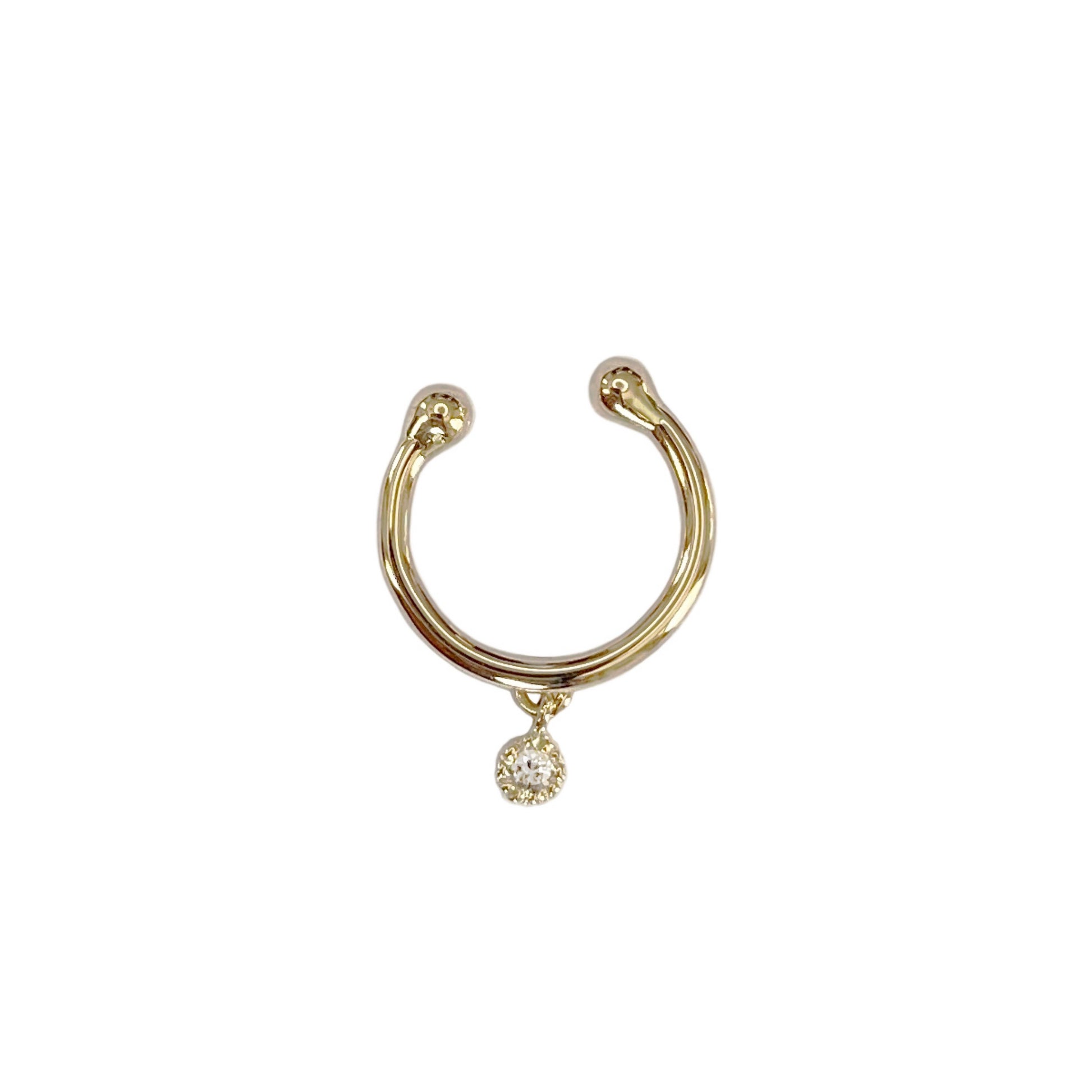 The delicate Noor Shamma Zina cuff is a gold cuff to be placed at the top of your eat with a single dangling white diamond that elevates any look. Each Noor Shamma piece is handcrafted in New York, USA. The cuff is available in 18 karat yellow, rose, and white gold. Made with white diamonds. Sold as a single piece. No piercing needed!
