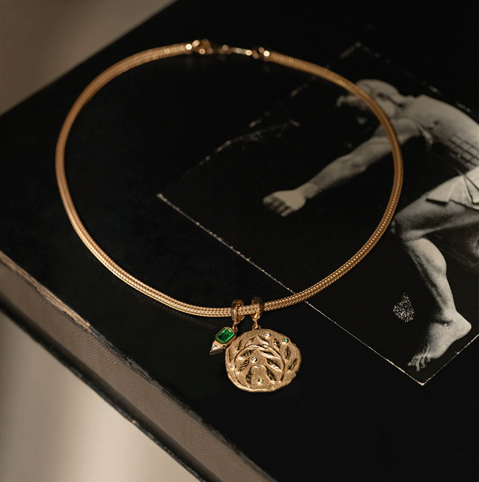 27mm coin; Made of 18K Yellow Gold, .03ct White Diamonds & .02ct Zambian Emeralds.