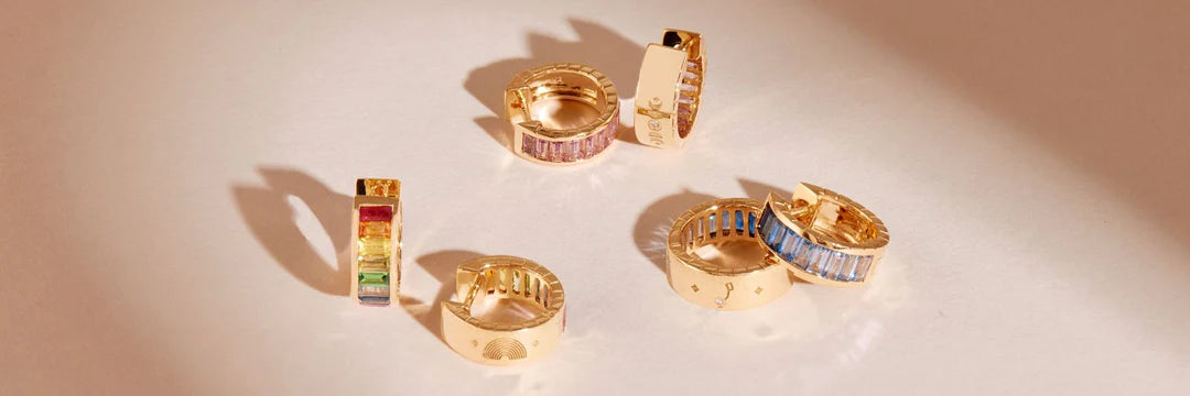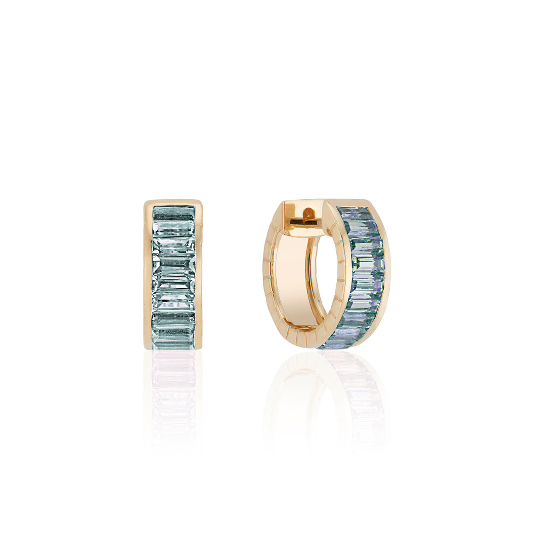 Our symbolic take on the everyday earring. These reversible huggies are crafted with a row of baguette-cut calming Aquamarine in an organic pattern, set in polished 18k yellow gold.