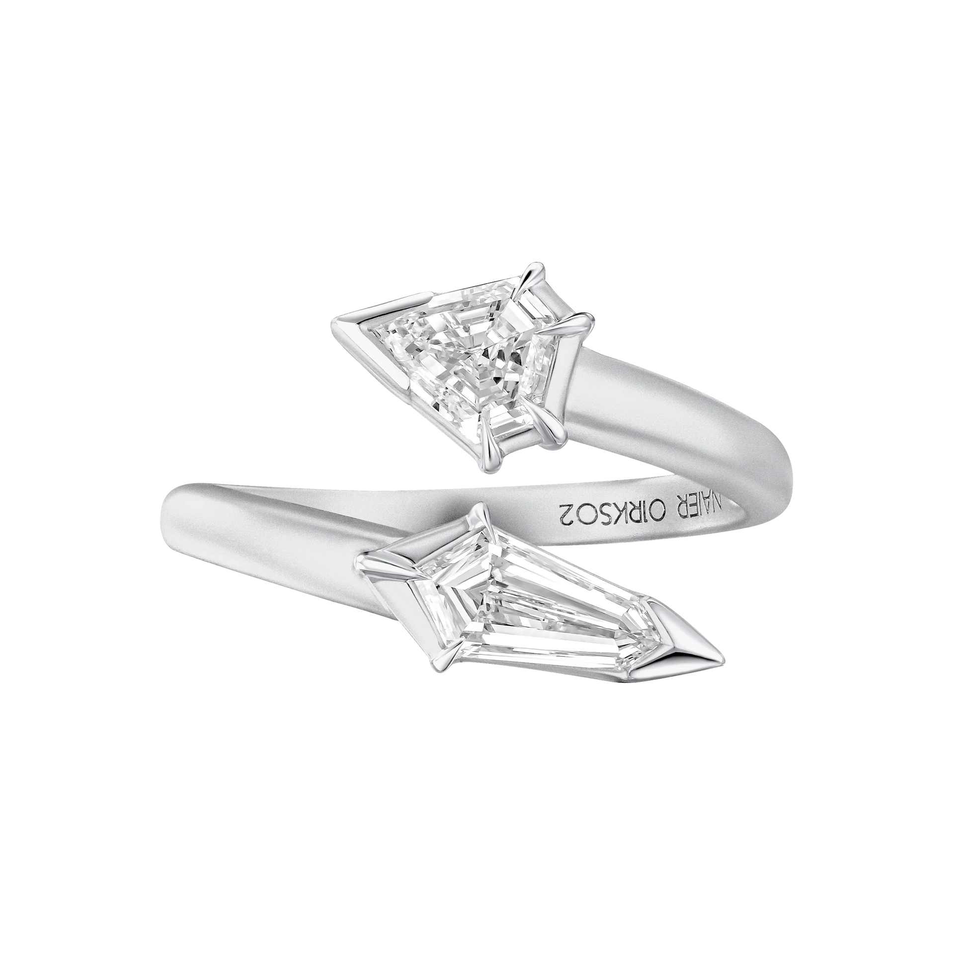 This striking ring features two gemstones—one shield-cut and one kite-cut—flanked by sharp, structured edges, symbolizing confidence and power. With 1 carat of diamonds and weighing 5.5 grams of gold, its dynamic design twists like celestial bodies converging, representing strength, resilience, and the ability to evolve with time.