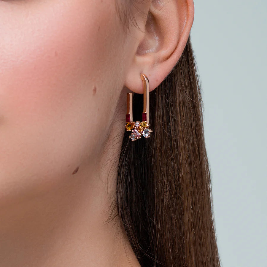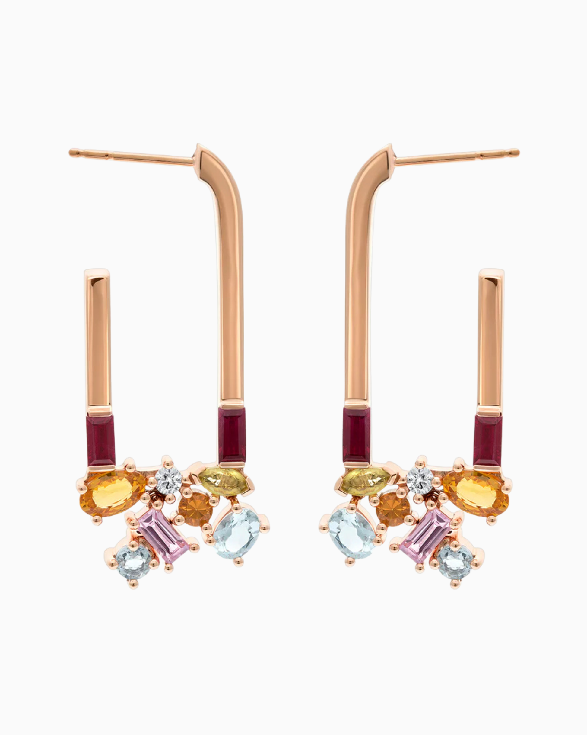 Reimagining the classic hoop, the Sunset Hoop Earrings is designed with an elongated graceful curve in magnetic rose gold that frames your face. Adorned with a constellation of aquamarine, diamond, and colored sapphires in sunset hues, these statement earrings ground your intentions while creating a mesmerizing effect. Their magnetic presence makes them the perfect centerpiece for any look.