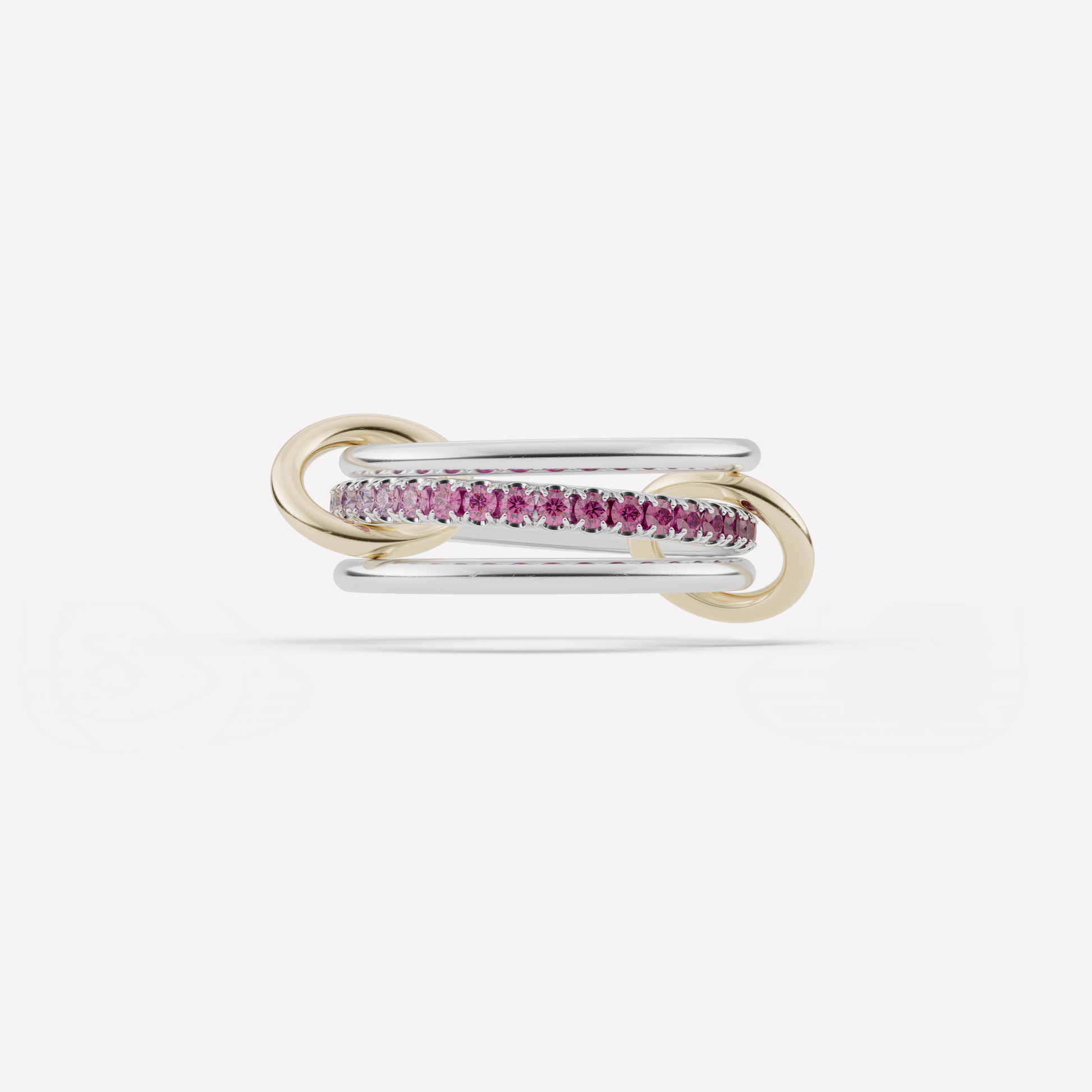 The Tigris is expertly crafted with a central band of u-pavé diamonds or ombré sapphires, framed by two equal-gauged bands of .925 sterling silver or 18k yellow gold. All bands are linked by orbiting 18k gold connectors, resulting in an elegant and lightweight complement to any ensemble. Each Tigris is artfully handmade in Los Angeles.
