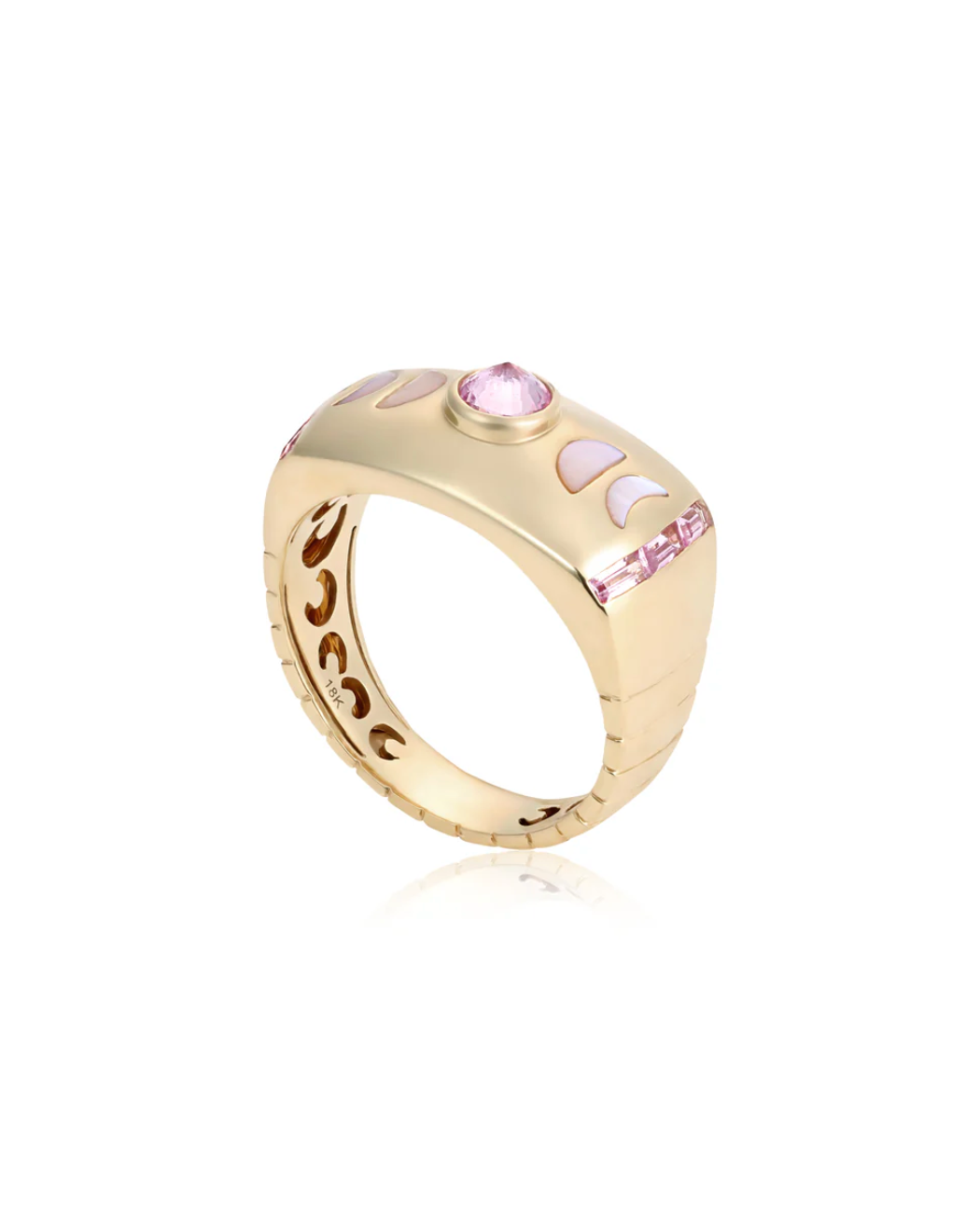 Details: Crafted in 18K Yellow Gold, with 0.487 cts Pink Sapphires and a 0.058 Pink Mother of Pearl inlay.