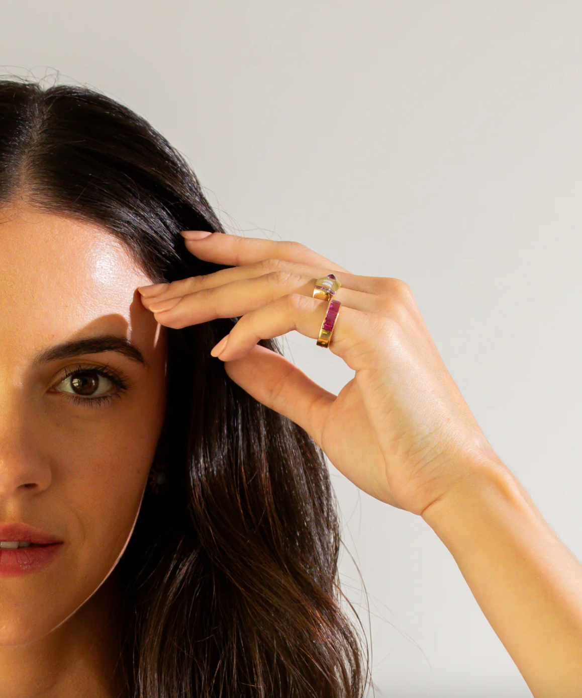 The Voyage Ombre Pink Sapphire Reversible Baguette Ring is a sleek, signature piece designed to add a radiant touch to your stack. Featuring a meticulously hand-selected row of baguette-cut pink sapphires, each gemstone catches the light beautifully, creating a stunning ombré effect. A meaningful gift for those embracing their intuition, this versatile design offers effortless elegance.