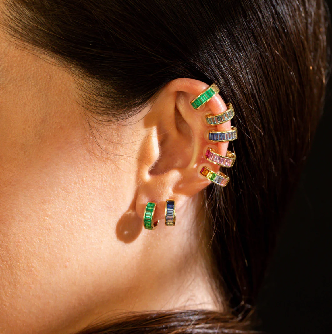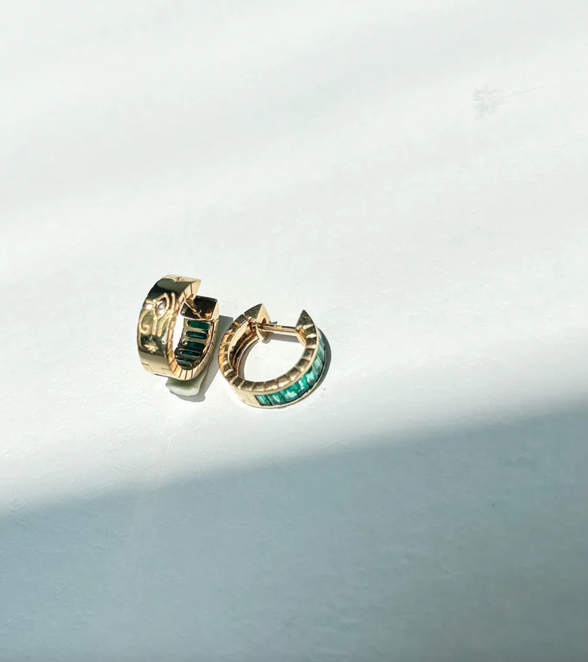 Our symbolic take on the everyday earring. These reversible huggies are crafted with a row of baguette-cut Emeralds in an organic pattern, set in polished 18K yellow gold.