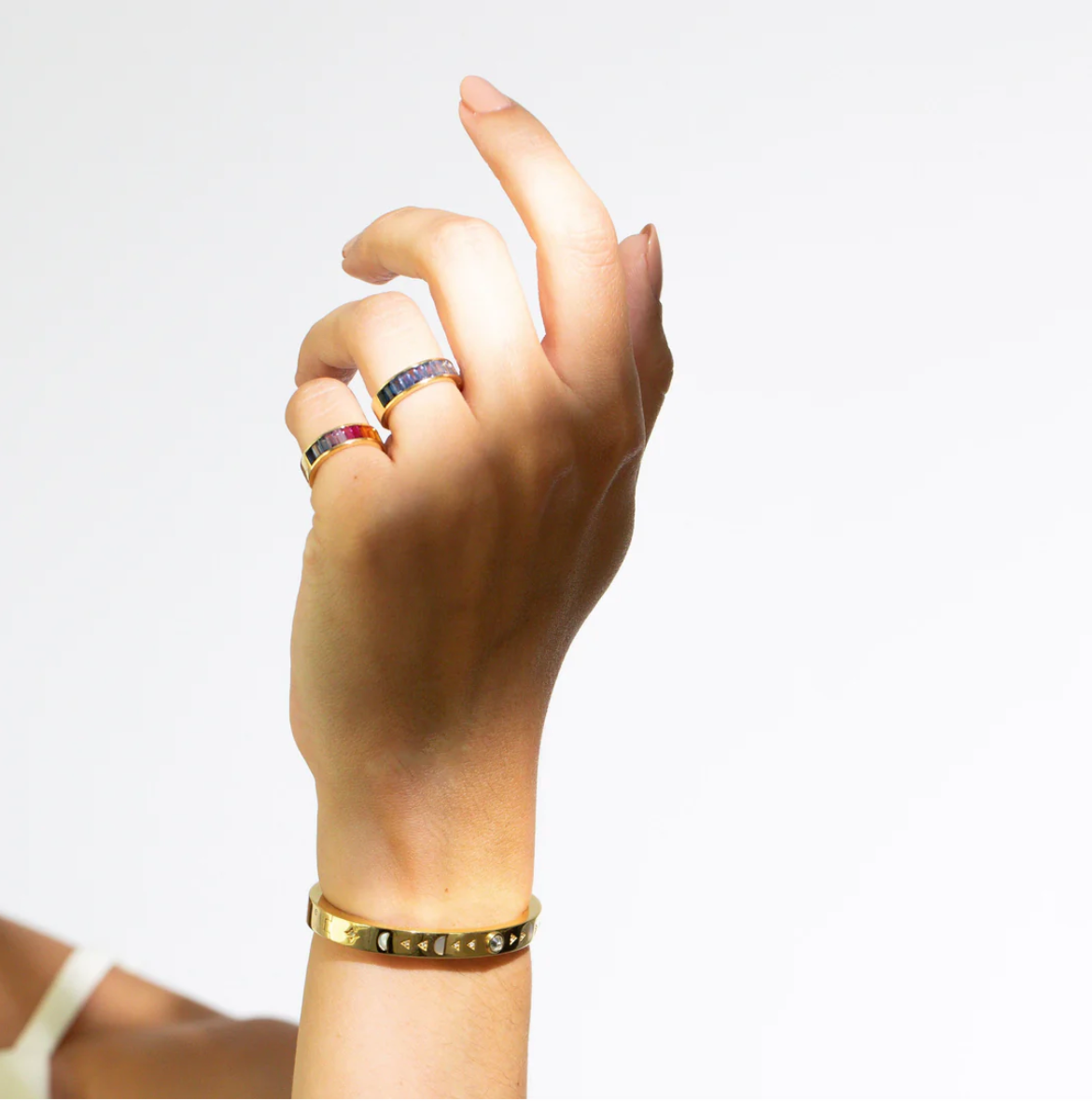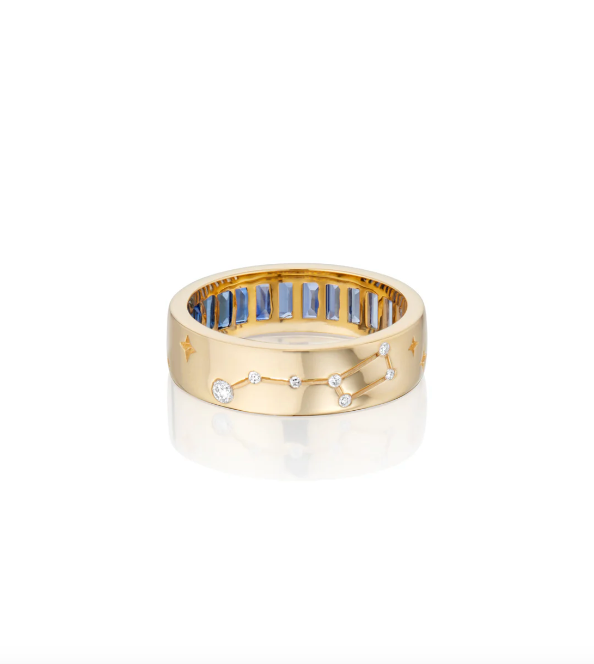The Voyage Ombre Blue Sapphire reversible baguette ring is a sophisticated and beautiful take on a jewelry staple. You will find yourself reaching for time and time again, this sleek ring is expertly set with a row of baguette-cut blue sapphires. Each stone has been individually selected and sorted to create a glorious ombre of shifting shades of blue, a stunning detail that elevates this ring to something truly special. Blue Sapphire is a symbol of strength and protection, so with this ring on your finger you can go forth into the world with confidence and ease. A companion piece to the Voyage Chalcedony Compass Pendant, together they make a powerfully talismanic set to help you find your direction. With our signature attention to detail, the reverse of the ring features diamond-set Ursa Major engraving detail. In 18k yellow gold, this blue sapphire ring is both versatile and striking, effortlessly adding a luxurious dash of color to your look. Add to your own collection, or gift to someone special and let them know you are always there for them.