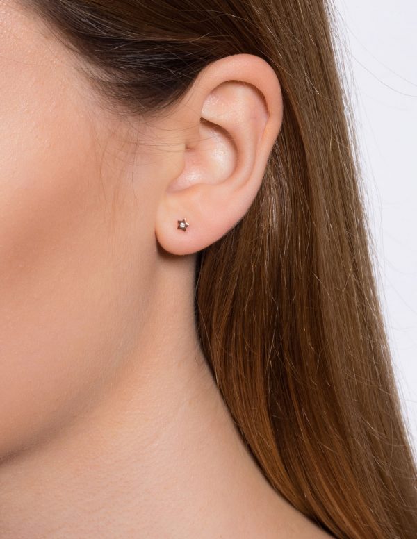 Perfect for everyday wear, white diamonds twinkle against blue e-coating over 18K rose gold star-shaped stud earrings.